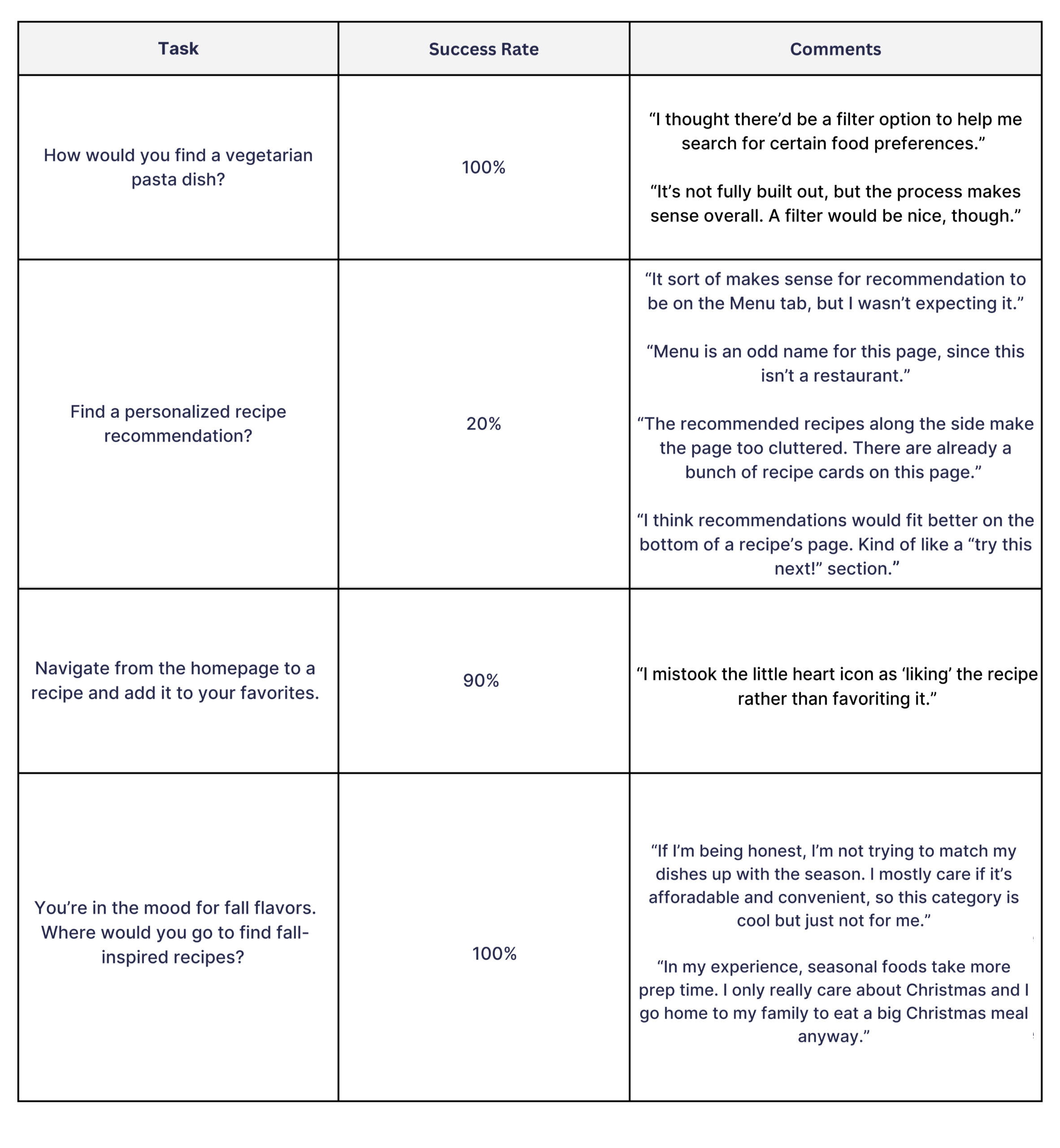Follow-up Questions Will Help You Solve ProblemsCreating a design that is feature-rich but not overwhelming proved to be a challenge for me during this project. However, I've learned that asking follow-up questions during usability testing is a great way to receive valuable design feedback on what users want to see and expect to see in a product they use.For example, during our first round of testing, many users mentioned that the 'Recommended Recipes' feature made the 'Our Meals' page feel too cluttered. When I asked follow-up questions on where the feature should be placed instead (if at all), half suggested moving the feature to the end of a recipe page in a "If you liked that, try this next" section. This suggestion indicates that users already have a clear expectation of how a similar site should function. Aligning the site with this familiar structure will make navigation smoother in the long run.We plan to implement and test this suggestion it in our next round of usability testing.