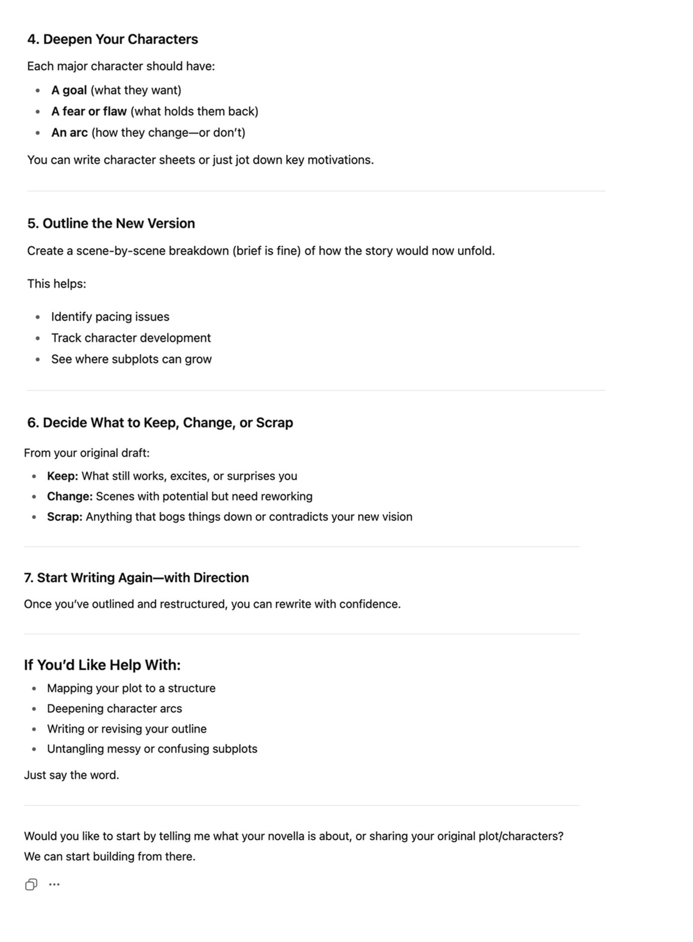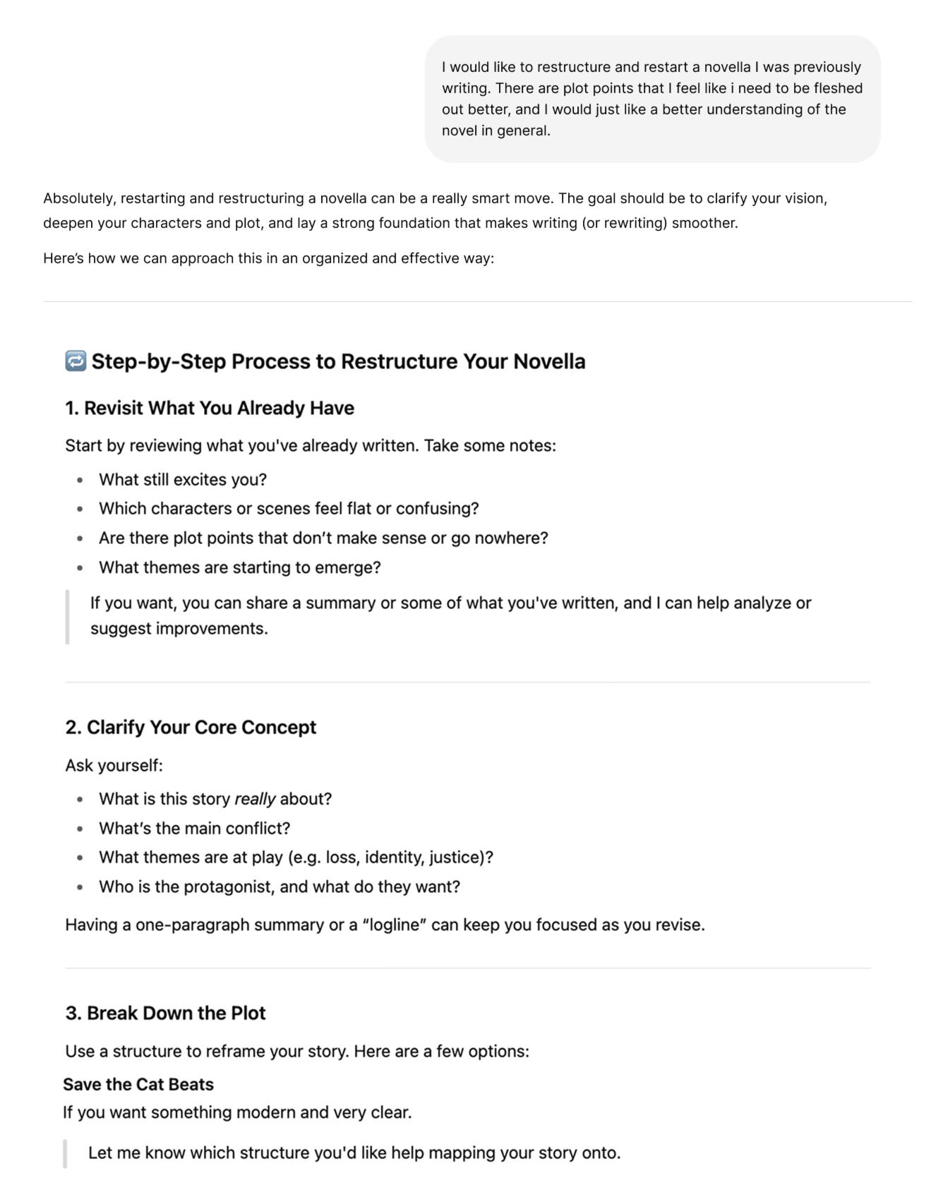 I intentionally gave ChatGPT very few parameters to see how it would go about suggesting how I should re-structure my novella and what kind of questions it would deem important to further assist me.I considered giving ChatGPT my novella's summary, but I was curious to know how it would advise me when given very little information.ChatGPT gave me a "step-by-step process."